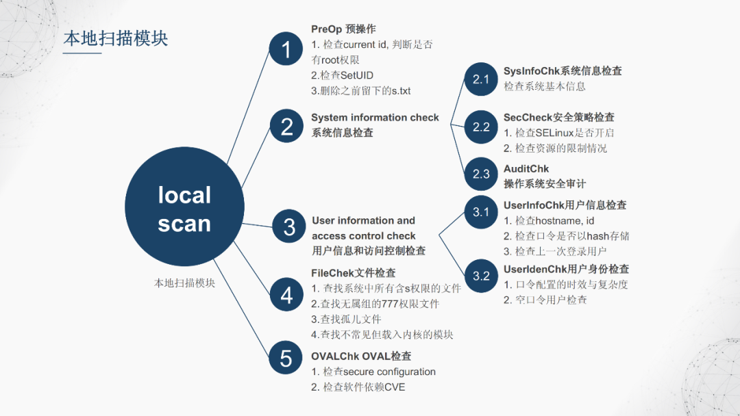 本地扫描模块共有5个部分,包含从操作系统本身安全策略配置,用户身份检查与访问控制到软件依赖CVE检查等安全检查项。