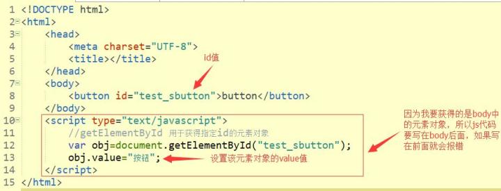 因为代码是是从上至下解析的,如果你要获得body里面的元素对象,却把script写在了body前面,所以当执行js里面获得元素对象的代码时就会报错: