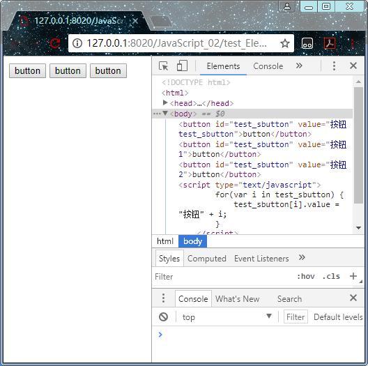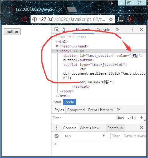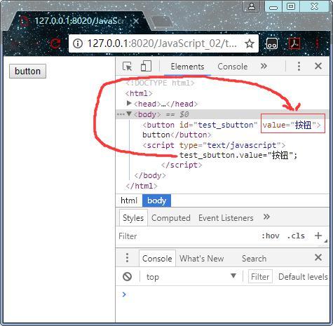 从审查元素中可以看到id值为test_sbutton的元素中的value值,为我js代码里设置的值。