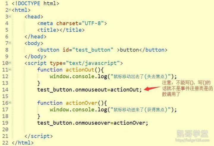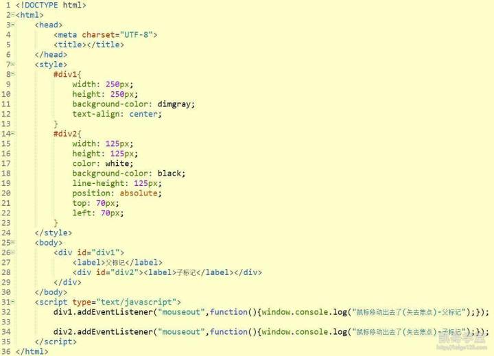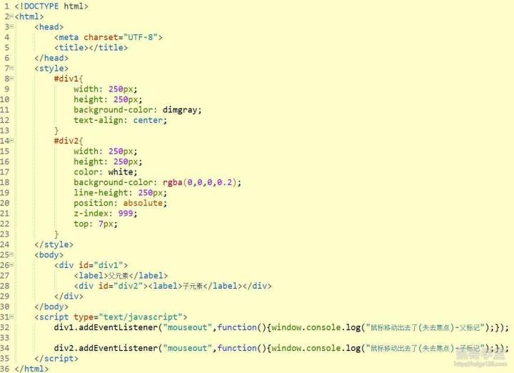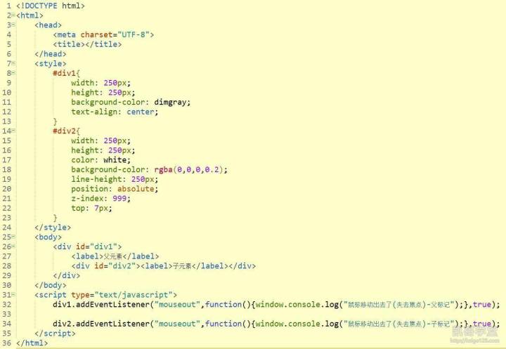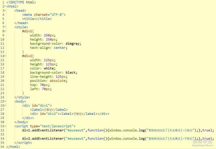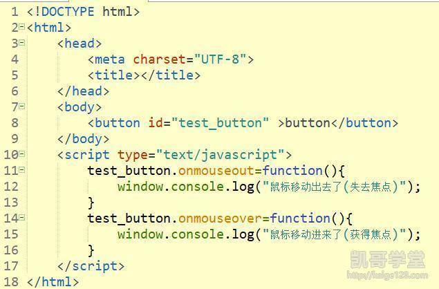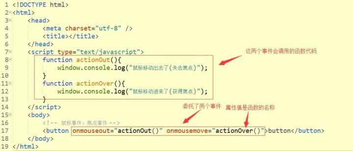 第一种方式,写好函数代码后,通过元素中的事件属性进行委托,下面用鼠标事件中的mouseout和mouseover事件进行演示,mousseout事件在鼠标移动出该元素时会触发,mouseover事件在鼠标移动进该元素时会触发,属于焦点类的事件: