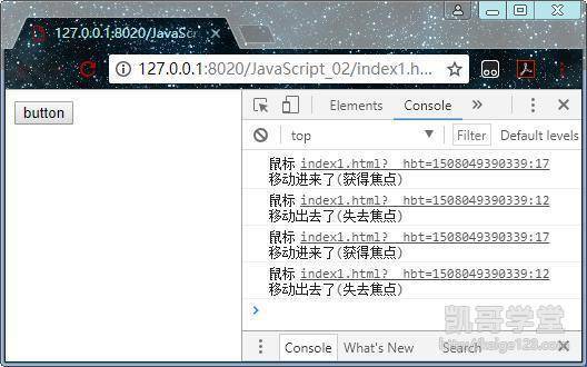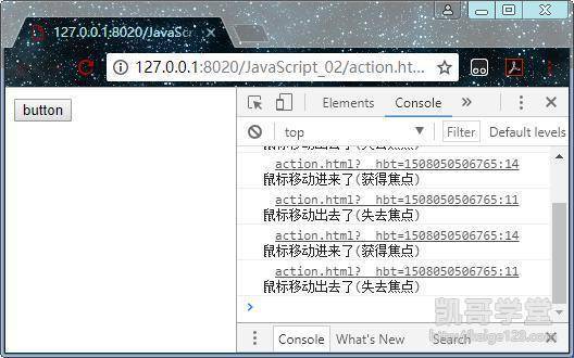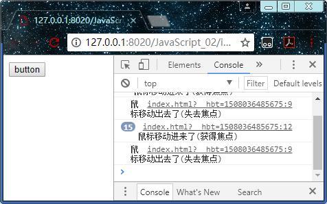 当鼠标的光标移动进按钮时会触发mouseover事件,移动出按钮时会触发mousseout事件,然后就会调用委托到事件中的函数代码,函数被调用执行就会在控制台中输出这些信息。