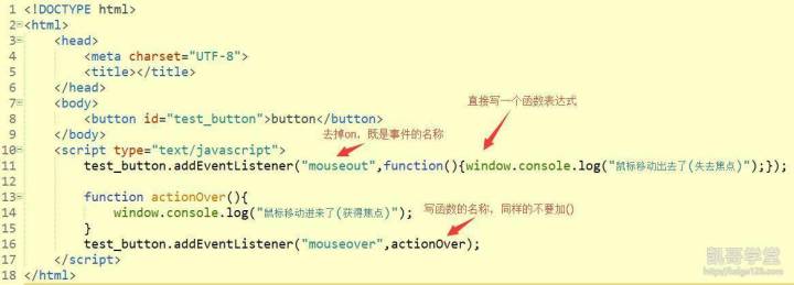 第三种方式,通过addEventListener函数添加一个事件监听器,需要传递事件的名称,和函数对象,函数对象可以是函数的名称,也可以是直接写一个函数上去: