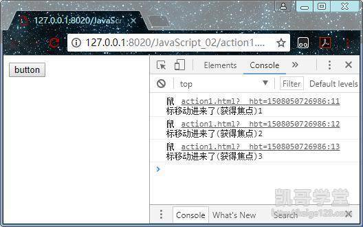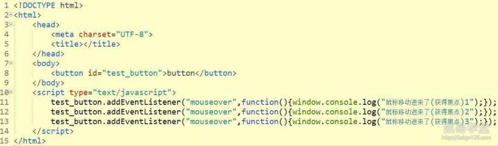 同一个元素对象的同一个事件,可以添加多个函数,这些函数可以执行不同的内容,例如我在一个button元素的mouseover事件中分别添加了三个函数,这三个函数各自打印了一句话,那么当我鼠标碰到按钮时,就会打印出三句话: