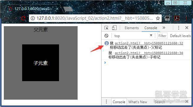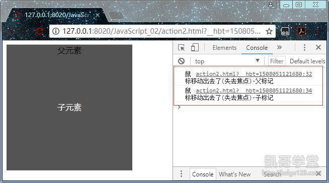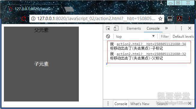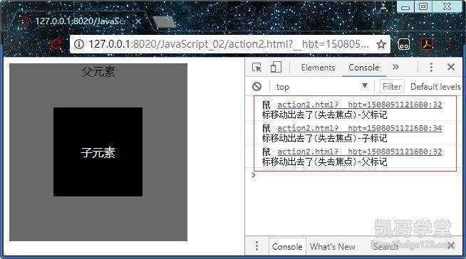 还有一种情况就是父元素和子元素不完全重叠,这种情况下不定义addEventListener函数的布尔值,当鼠标移动到子元素时先触发父元素的事件,然后移出子元素时先触发子元素的事件再触发父元素的事件,这是因为默认情况下子元素的事件先执行,所以父元素的事件不会连续执行。