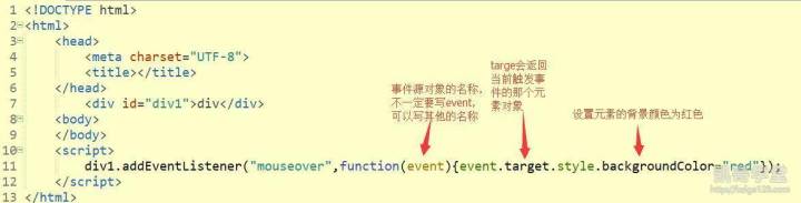 通过事件源对象调用target属性设置元素的背景颜色代码示例: