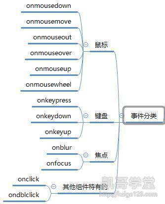 以上只使用到了鼠标事件中的mouseout和mouseover事件,事件还有很多,以下是常见事件的分类思维导图: