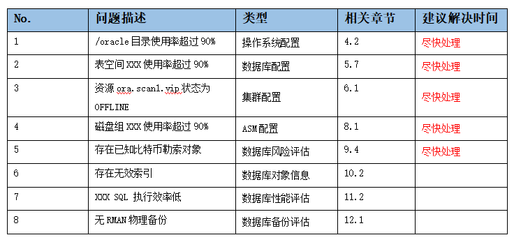 ['磁盘组XXX使用率超过90%', 'ASM配置', '8.1', '尽快处理'],