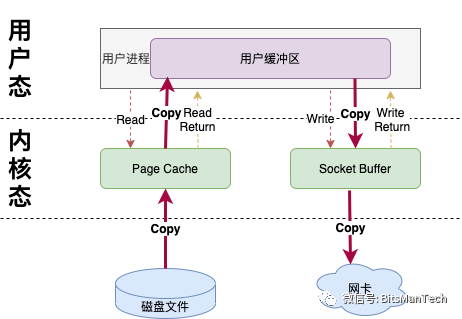 Linux的标准IO过程中,数据将缓存在Page Cache中。也就是说,在读取数据过程中,数据将首先被复制到内核缓冲区(Page Cache),之后再由内核缓冲区复制到用户缓冲区中;在写数据过程中,用户缓冲区中的内容也将首先复制到内核缓冲区,进而被写到磁盘或者通过socket发送到网络。