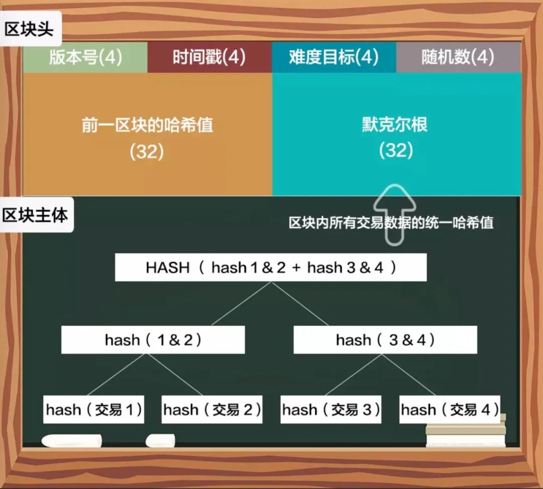 区块主体中是一颗默克尔树,就是要将树上的节点(树的最下层称为叶子节点,区块链中叶子节点就是交易;其它节点都是为了计算默克尔树根而形成的冗余节点,没有实际的数据)的哈希值两两哈希后形成新的节点,重复哈希直到只存在一个哈希值为止。这个最终的哈希值就是默克尔树根。由于哈希值是全局唯一的,可以想见,如果一个交易(树的叶子节点)发生变化,就要修改一整条哈希路径,直到修改掉默克尔树根为止。