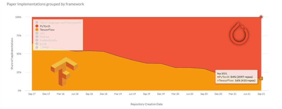 在最新的一个月(2021年9月)新公开的论文代码中,两者的使用量已经相差了5倍,这就可以推测出PyTorch