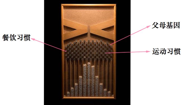 一颗弹珠一路滚下来会多次选择方向,最终的分布会接近正态分布: