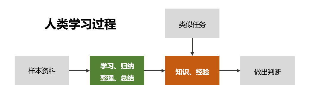 我们可以看到以上两个例子,人类会非常容易的辨别出垃圾邮件与猫狗,但是让计算机做却非常困难,因为这与发明计算机的最初任务有本质区别。比如对1亿数据进行混合四则运算或大小排序,这些任务让人类执行会非常低效,但计算机却可以快速完成,而人工智能要处理的任务与计算机最初的任务恰好相反。这就让人们思考人类到底是怎么进行学习的。同是上例,拿我们人类来说,从婴儿根本不知道猫狗到现在我们可以一眼分辨出猫狗,是一个经验学习过程:首先需要一定的样本资料,从小我们可能在电视中、现实中或图书中,爸爸妈妈告诉我们,那是一只猫,那是一只狗,我们不断接受猫和狗的信息资料,然后大脑将接受的信息进行学习、归纳、整理、总结,最后形成我们的知识与经验。之后,我们再遇到类似的任务,比如在大街上看到一只流浪猫或流浪狗,我们就可以马上根据以往的经验做出判断,这是一只狗还是一只猫。生活中,我们大多数的学习过程都是这样。