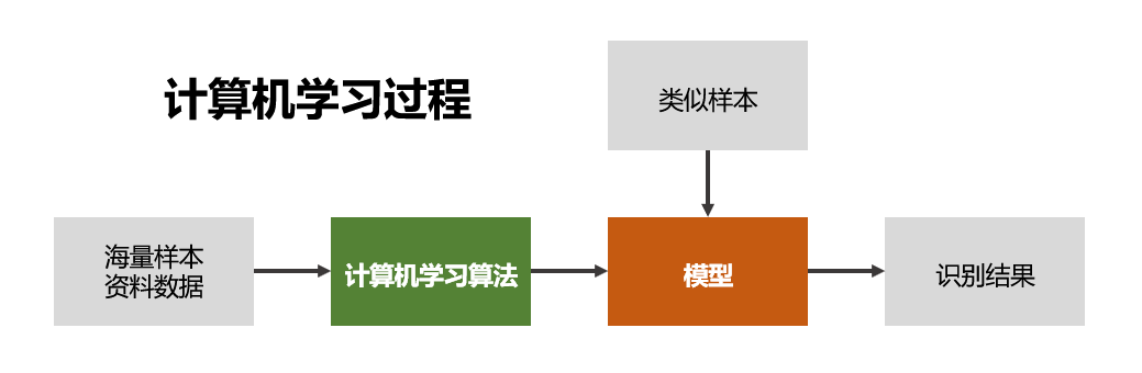 其实计算机学习的过程和我们人类学习的过程是极为相似的,我们给计算机输入大量资料数据,让计算机学习算法,然后得到学习(训练)后的模型,之后再输入相似样本,就可以识别结果。