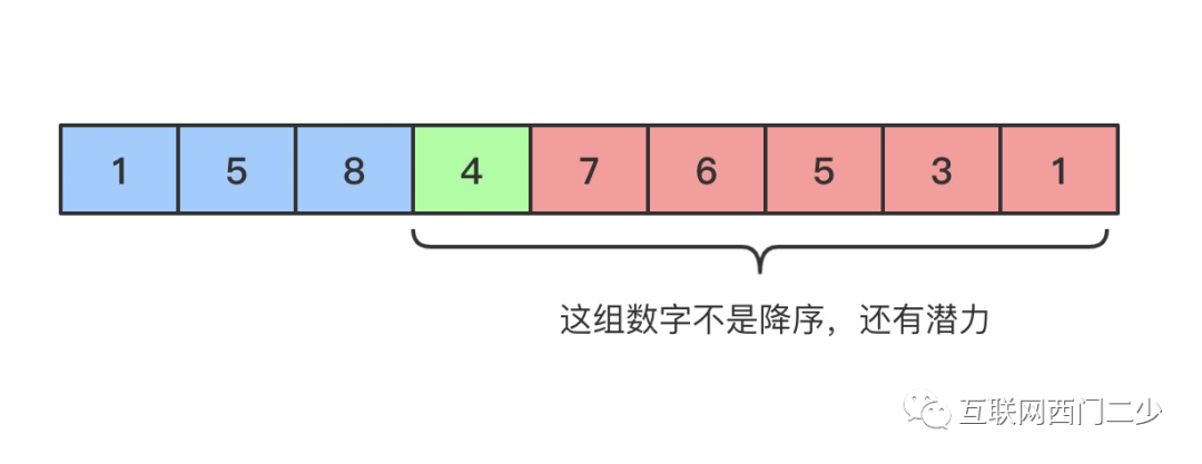 为此,我们向前再多看一位数字。如下图所示,这时的数字不是降序,它是有潜力通过内部交换而得到下一个排列的。