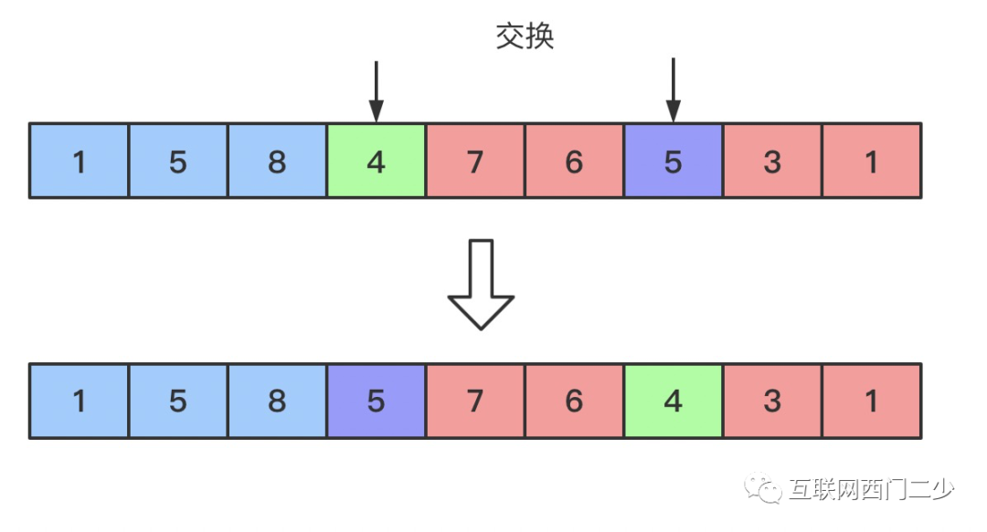 如果4与7或者6交换,很明显是大了太多了;与3或1交换,又会比当前的小。那么选择的依据就是将将比4大的数字,那就是5。