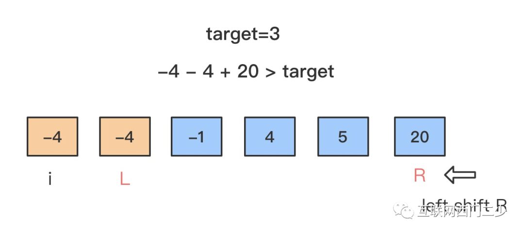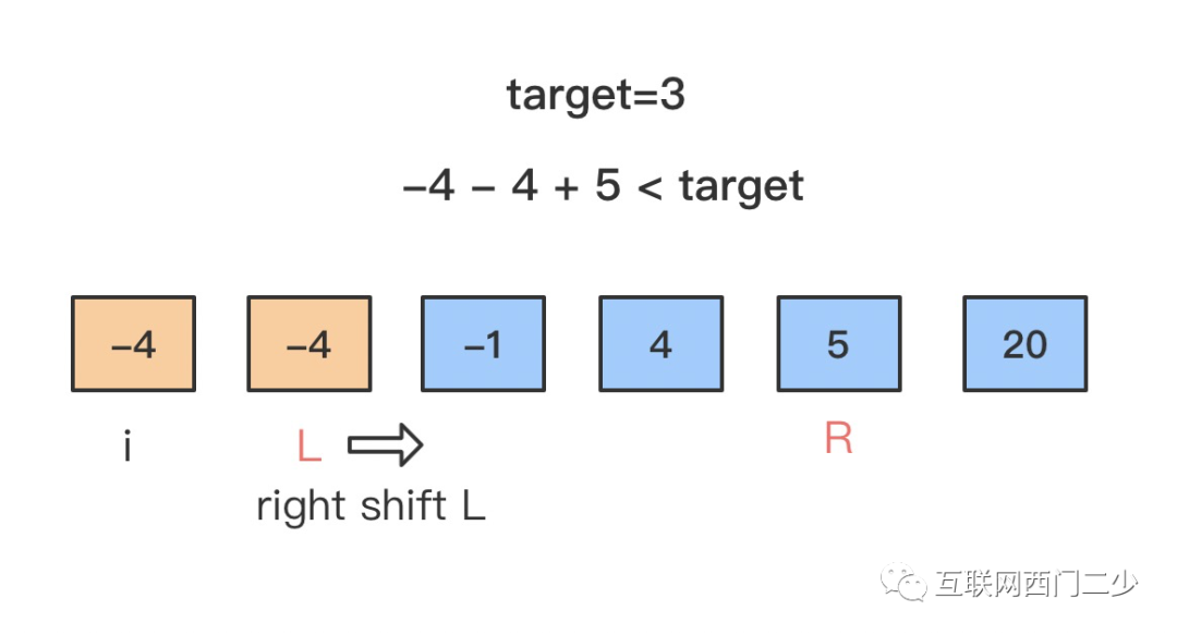 情况2——当nums[i]+nums[L]+nums[R] <= target时,我们需要右移