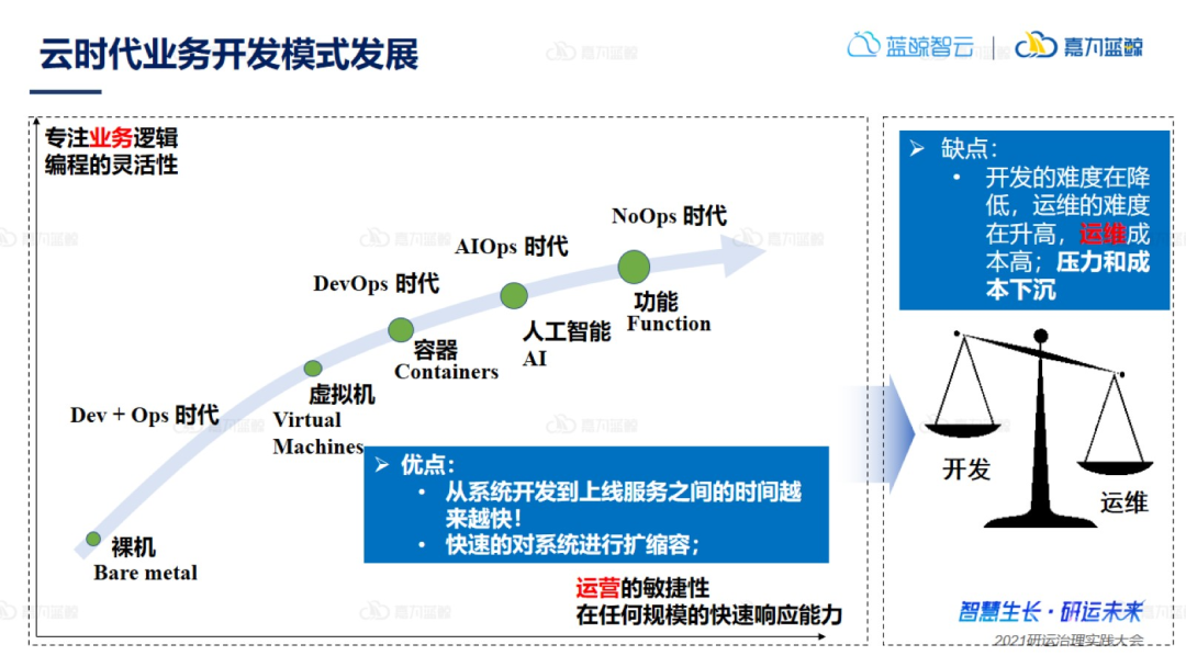 回顾云原生技术的发展轨迹,云计算从Dev+Ops时代开始,就一直朝着粒度更小的方向在发展,从裸机Bare metal、到虚拟机Virtual Machines、到容器Containers、到人工智能AI,到函数功能Function、再到未来更加细粒度的计算,云计算也在经历着DevOps-AIOps-NoOps的时代演进。溯其根源,新技术新能力的诞生,都是为了实现开发速度越来越快,交付速度越来越快,业务响应越来越快的目标,真正提升运营的敏捷性。