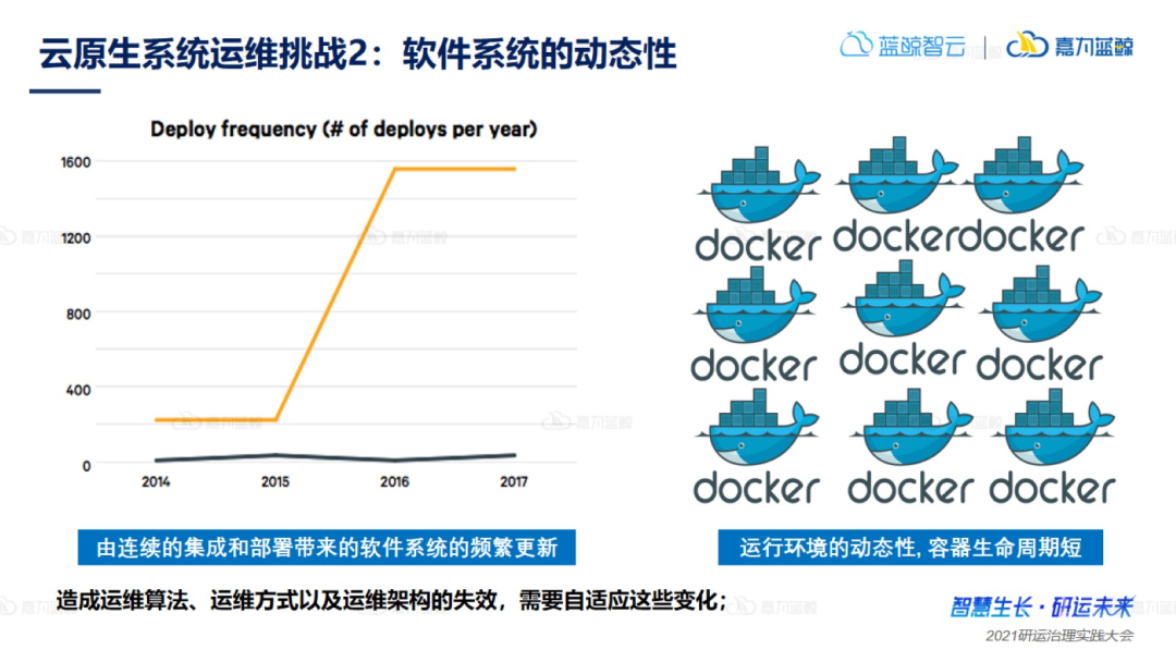 在DevOps提出以后,软件交付的周期越来越短,与此同时,软件逐步采用容器微服务架构,这两种技术的结合使得系统难以找到一个稳态,这对于传统的运维方案是一个巨大的挑战。我们无法通过训练一个常规的静态模型来进行异常检测、根因定位等工作。另外,容器本身生命周期从创建申请、扩展、销毁等都是一个动态的过程,频繁的动态变化使得智能运维难度急剧加大。
