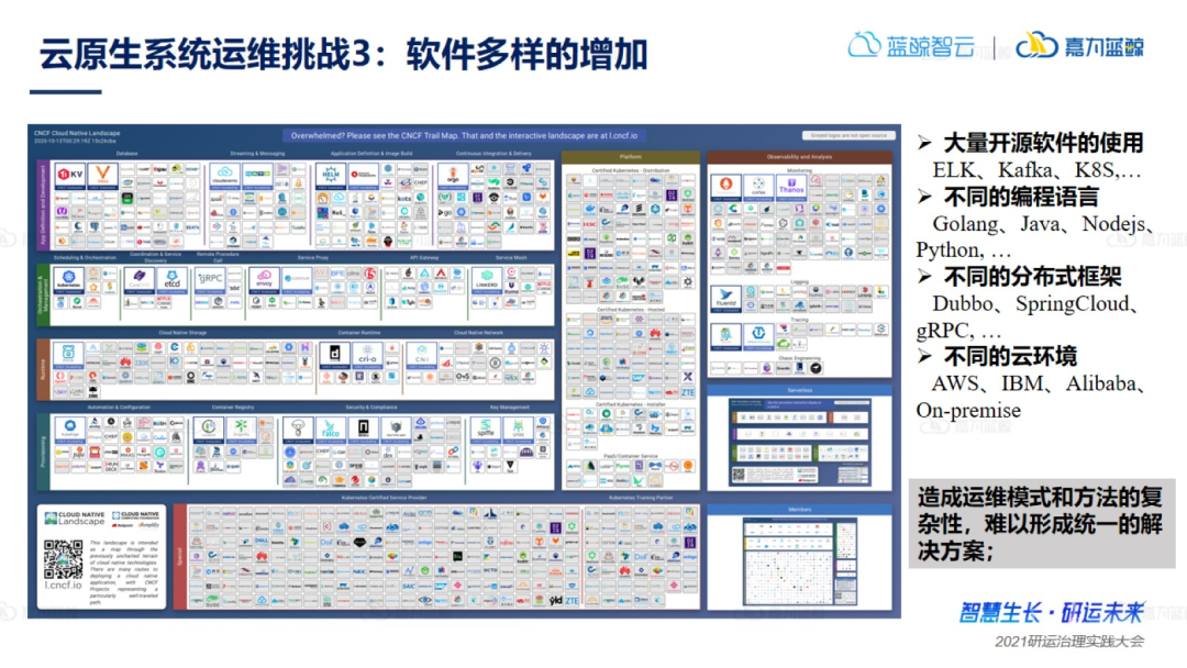 如上图,在云原生知名社区CNCF上,开源软件的数量是十分庞大的,面对如此海量多类型的软件,运维又该如何统筹管理,如何精确捕捉其性能和状态呢?软件多样性增加环境下,运维模式和方式的复杂度呈指数级增加,难以形成统一解决方案。