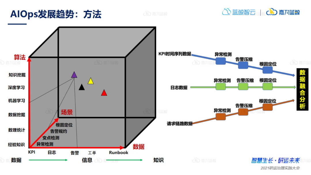 AIOps可以从算法、数据、场景三个维度去分析处理,通过数据驱动运维,最终实现从数据中发现信息,从信息中挖掘知识,形成解决问题的知识库,最终实现数据融合分析,也即是AIOps的发展路径。