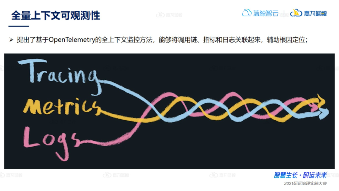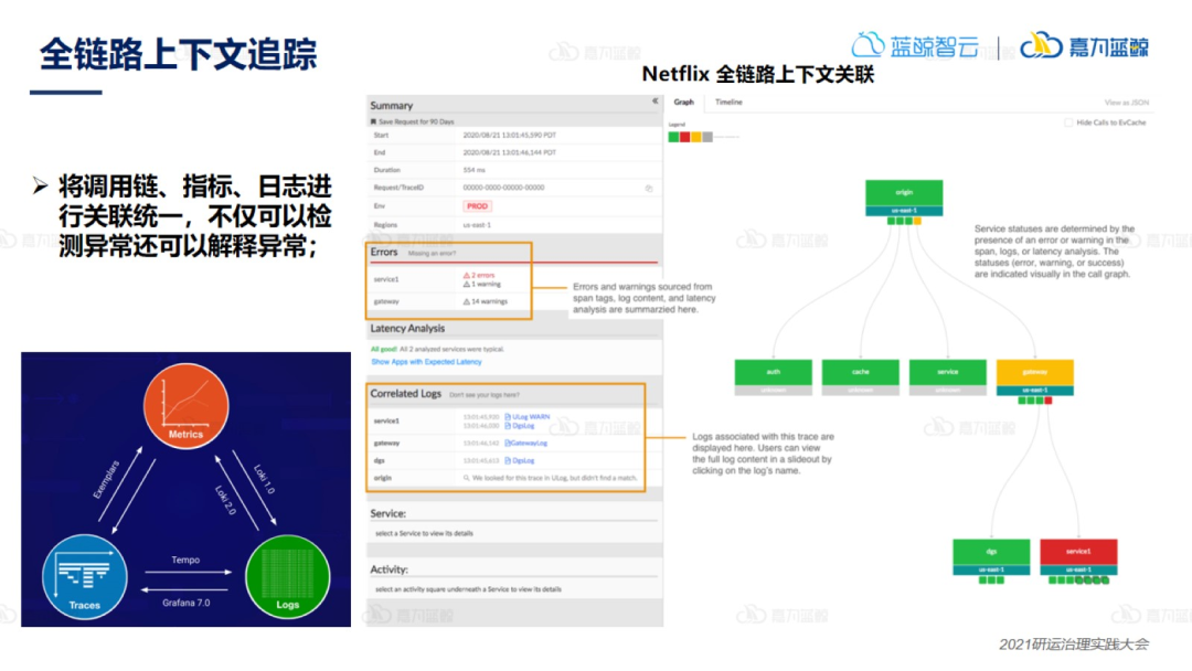 在全链路上下文关联方面,已经有一些走在前列企业实在实践了,但并不够完善,例如Metric这类指标并没有做细粒度的关联,数据分析上,仅仅提供了可视化么能力,缺少关联数据的分析。