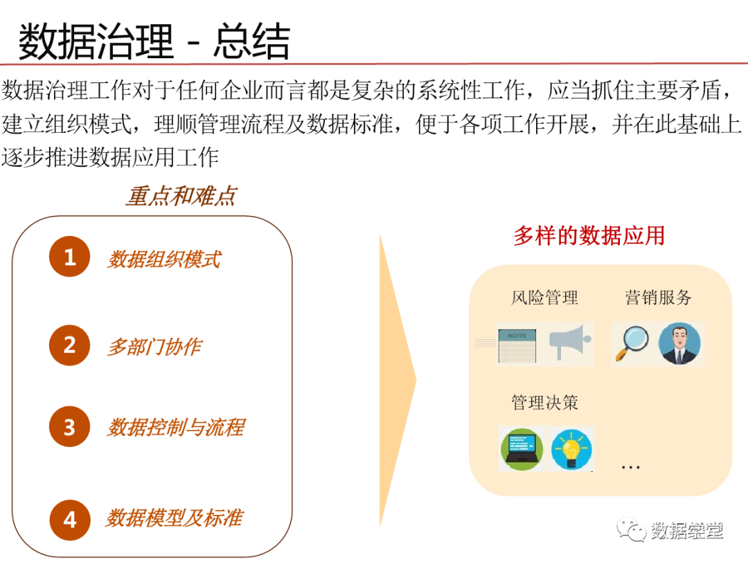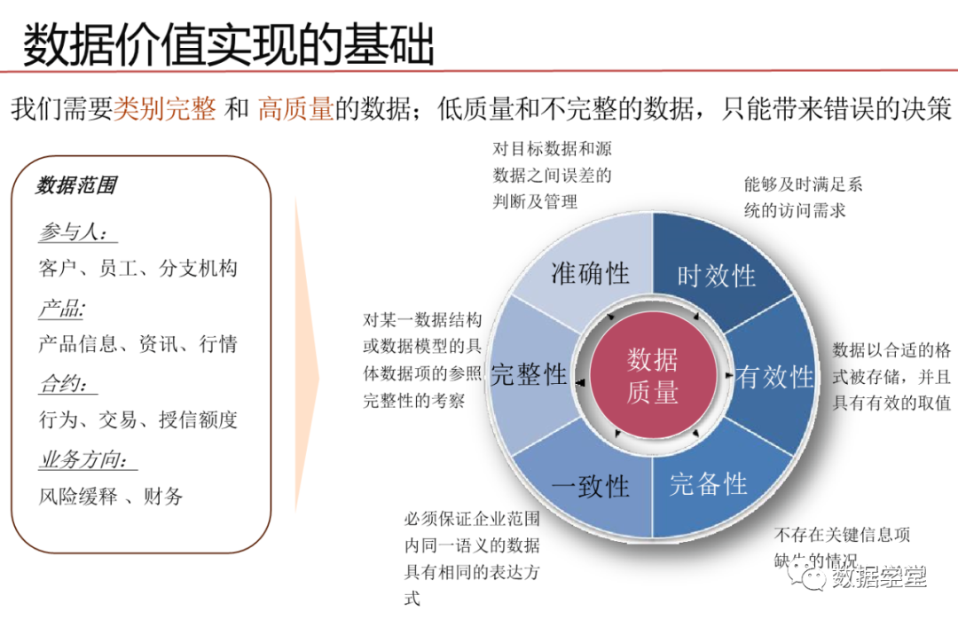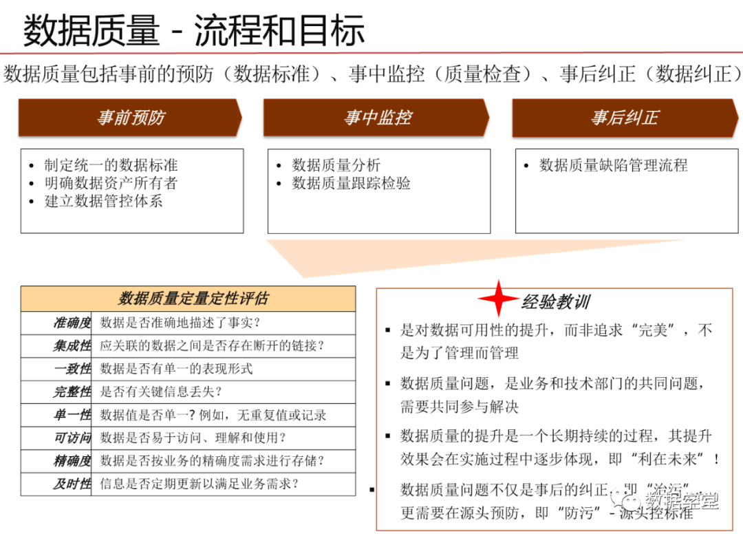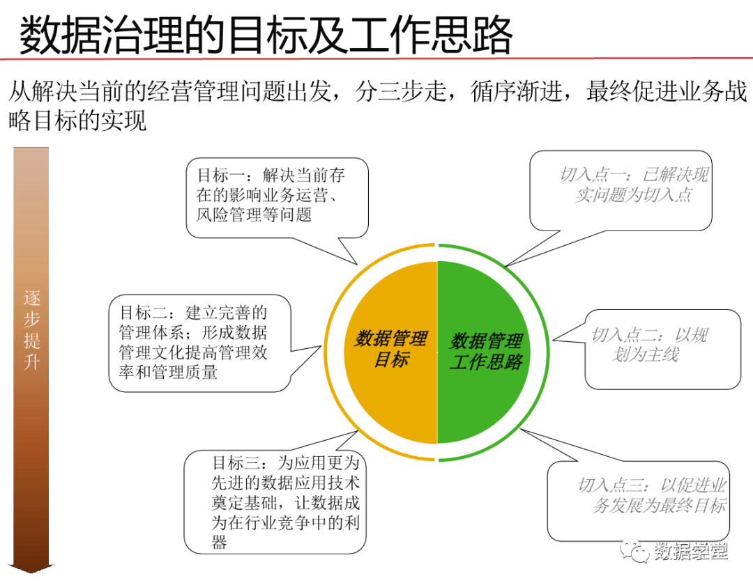数据治理其实是一种体系,是一个关注于信息系统执行层面的体系,这一体系的目的是整合IT与业务部的知识和意见,通过将流程、策略、标准和组织的有效组合,对企业的信息化建设进行全方位的监管,需要企业高层的授权和业务部门与IT部门的密切协作。目标是保证数据的有效性、可访问性、高质量、一致性、 可审计和安全性。