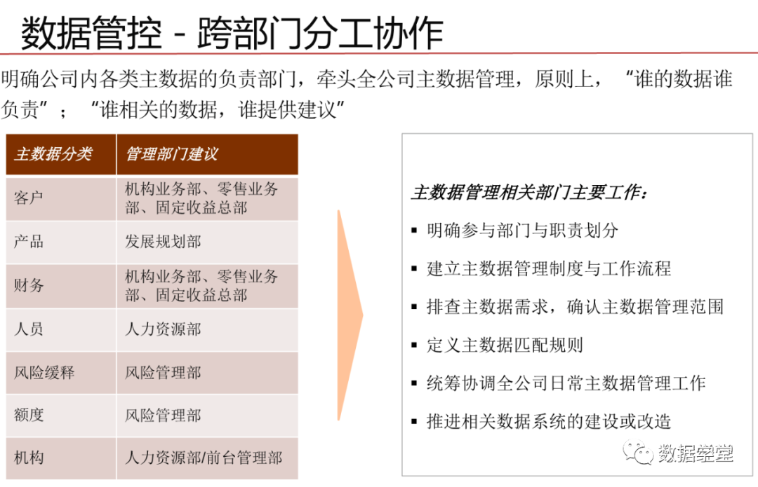 数据治理体系的建立是促进企业数据管理体系建设和执行体系落地的有力支撑平台,将分散、多样化的核心数据等通过标准化、质量探查、清洗、集成及监控等技术手段进行优化,形成企业内的数据治理体系,并结合企业组织结构,形成数据管控执行体系,在企业内部持续运行,提升、挖掘主数据的应用价值。