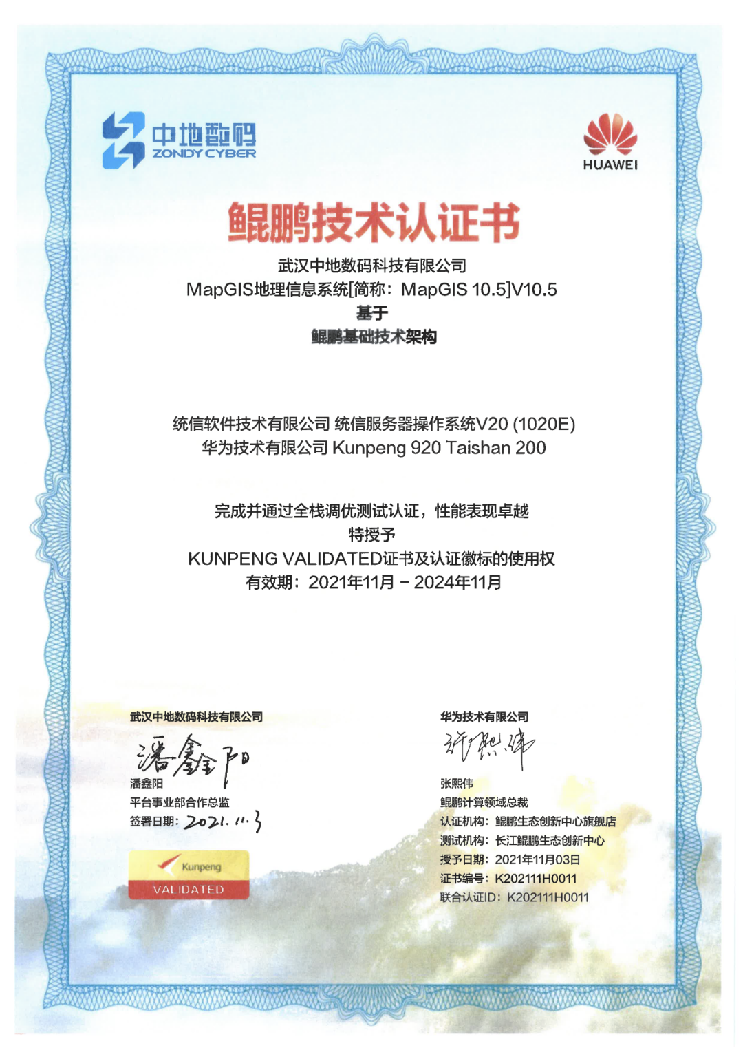 近日,武汉中地数码科技有限公司与长江鲲鹏生态创新中心联合推进的MapGIS大数据与云平台联合解决方案,顺利获得鲲鹏Huawei Validated认证,这也是全国首个基于统信服务器操作系统V20完成鲲鹏Huawei Validated认证的产品,标志着MapGIS地理信息系统V10.5成功完成“统信UOS+鲲鹏”的技术全栈适配。