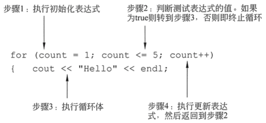 初始语句是一个赋值语句, 它用来给循环控制变量赋初值; 循环条件是一个关系表达式, 它决定什么时候退出循环; 一次循环结束时执行的语句是每循环一次后循环控制变量按什么方式变化。这三个部分之间用分号(;)分开。