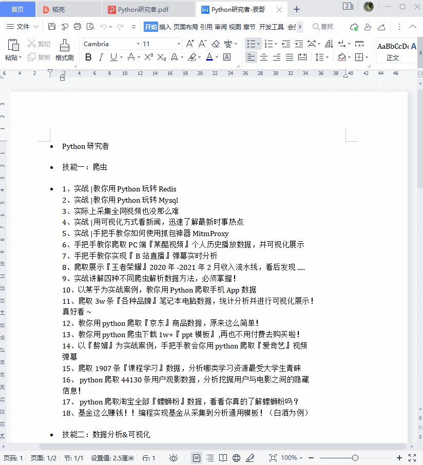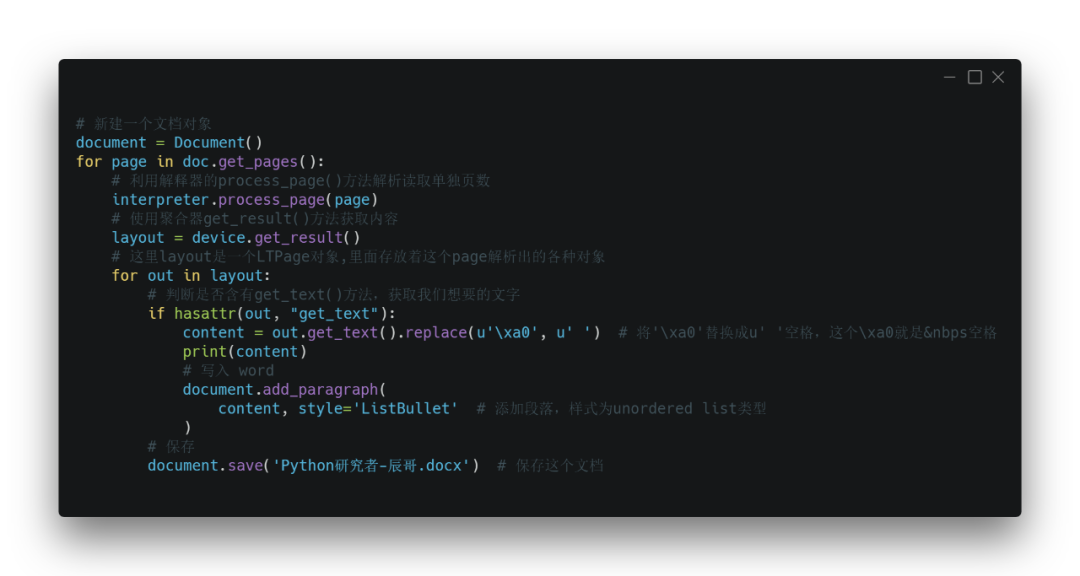 在遍历pdf内容里面将内容逐步写入保存。最后保存命名为:Python研究者-辰哥.docx