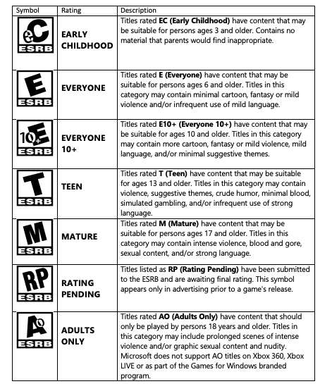 在我们开始创造问题或假设之前,我们首先需要了解电子游戏评级。我们需要先熟悉TX的评级系统然后才能继续前进。这些评级在他们的网站上有详细描述,但我也在下面的表格中总结了评级。
