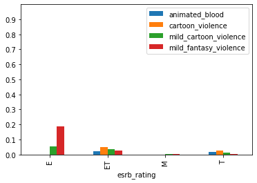 %matplotlib inlineimport numpy as nppivot.plot.bar(ylim=(0,1),yticks=np.arange(0,1,.1))
