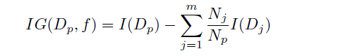 其中,f是具体的特征,Dp Dj是当前数据集和用特征f分割后第j个子节点的数据集,I是某种度量,Np是当前数据集样本个数,Nj是第j个子节点的数据集中样本个数。