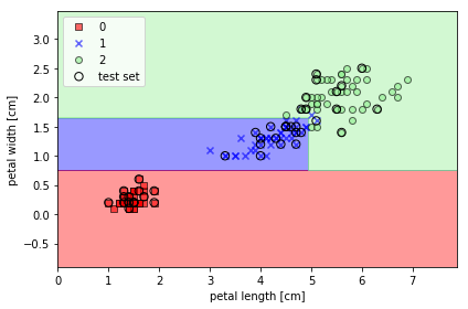from sklearn import datasetsimport numpy as npiris = datasets.load_iris()X = iris.data[:, [2, 3]]y = iris.targetfrom sklearn.model_selection import train_test_splitX_train, X_test, y_train, y_test = train_test_split(X, y, test_size=0.3, random_state=0)from sklearn.tree import DecisionTreeClassifiertree = DecisionTreeClassifier(criterion='entropy', max_depth=3, random_state=0)tree.fit(X_train, y_train)X_combined = np.vstack((X_train, X_test))y_combined = np.hstack((y_train, y_test))plot_decision_regions(X_combined, y_combined,classifier=tree, test_idx=range(105, 150))plt.xlabel('petal length [cm]')plt.ylabel('petal width [cm]')plt.legend(loc='upper left')plt.tight_layout()# plt.savefig('./figures/decision_tree_decision.png', dpi=300)plt.show()