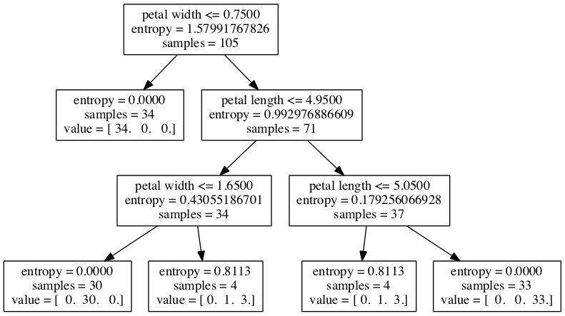 from sklearn.tree import export_graphvizexport_graphviz(tree,out_file='tree.dot',feature_names=['petal length', 'petal width'])