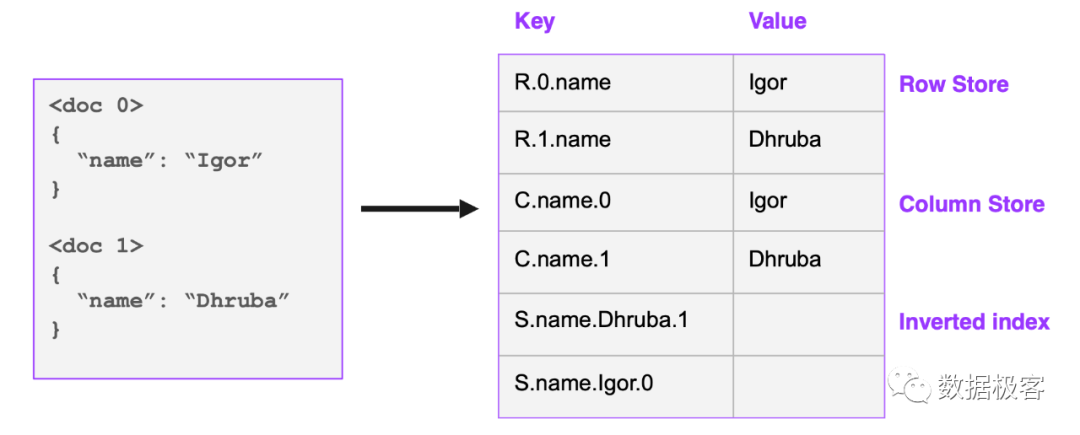 在Disk Cache这个问题解决之后,我们来看一下进一步支撑OLAP分析型需求,存储上可以如何考虑。首先再次回到RockSet,我们来看看它的方案,如下图所示,它引入了一种称为Coveraged Indexing的技术:给定一条记录,要存3份数据:行存,列存,倒排索引,但是3者在底层都共用Key-Value接口,如下图所示: