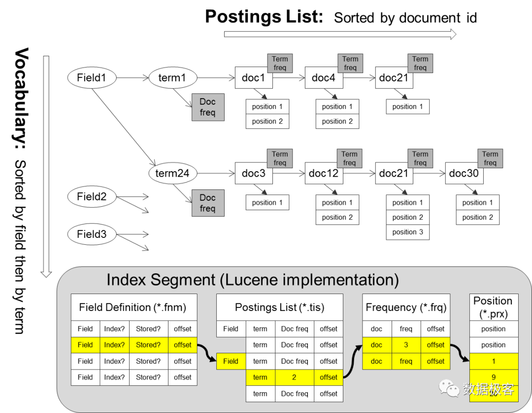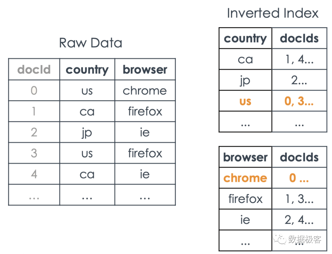 之所以这么任性,是因为S3太便宜了,因此多存几份数据,也不是什么大问题。在这里,行存服务类似于大规模Serving的点查询,列存服务大多数查询,而倒排索引则服务部分纯选择型查询,或者全文搜索。注意这里,按照Key Value接口抽象的列存,导致巨大的序列化开销,比优秀的列存实现(如ClickHouse)等慢10倍以上。而倒排索引,也是一种比较另类的设计。下图是典型的倒排索引结构: