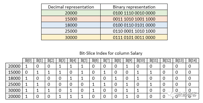 常规的倒排索引构建,通常围绕字符串文本类型。然而在OLAP数据库中,存在大量的数值类型列, 如果倒排索引无法对它们处理,那么能够满足的场景将会非常受限。针对数值类型,包括整数和浮点数,ThinkBase同样建立倒排索引,具体理念来自于BSI(Bit Sliced Index)[7]。其大概做法为:将选定的列值转换为二进制表示,并将其垂直切为Bitmap位图(位向量)。举例来说,在下图的employee表中,假设我们需要对工资这一列建立倒排索引。