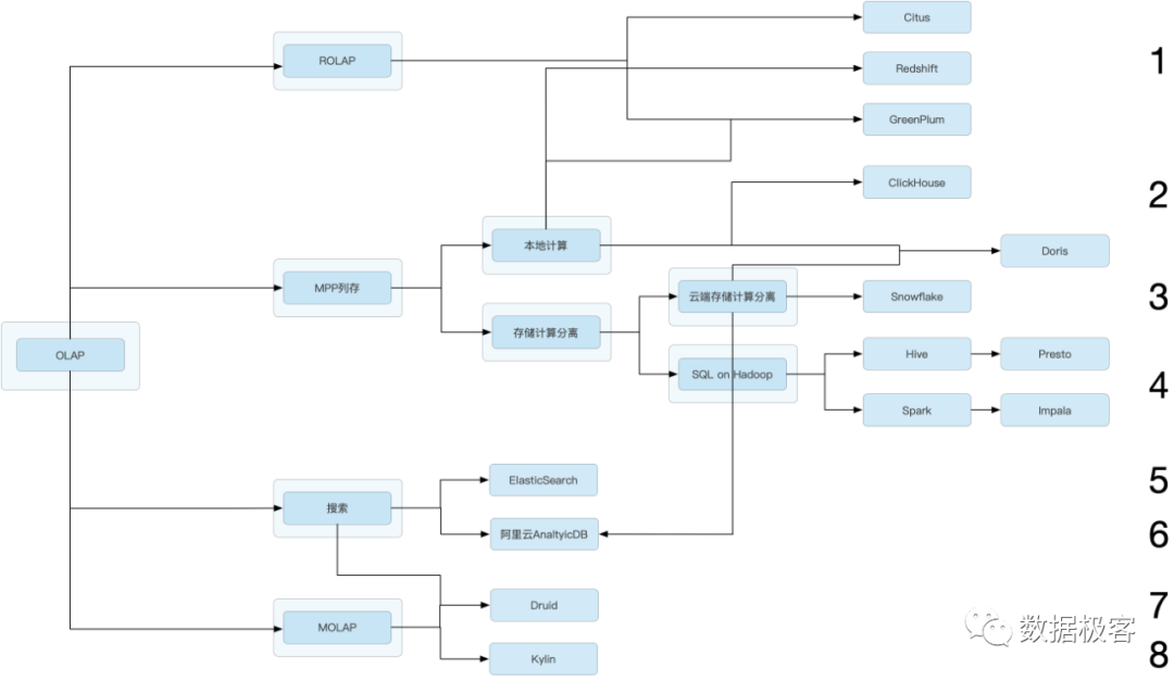 我们对以上各种OLAP按照更细的分类做个简单总结,分类如前图所示: