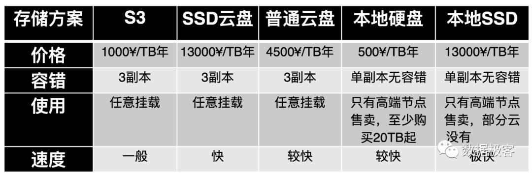 需要说明的是,表中提到的3副本,实际可能不一定,但用户无需关心,只需要知道存储通过多副本机制提供高可用能力即可。从表中可以看到,S3真是便宜啊,比本地硬盘都便宜(因为本地硬盘不具备多副本高可用能力),而且本地硬盘,在公有云当中,只有非常有限的实例才能购买,这些实例通常非常巨大,例如单个节点挂载20TB的本地硬盘,因此通常都是给在公有云当中自行部署大数据系统服务的,这会导致计算和存储资源的严重不均衡。那么,是否仅仅依赖公有云最便宜的计算和存储,就可以构建便宜的解决方案,从而真正降低成本了么?答案显然并非如此,这里边有若干因素需要考虑: