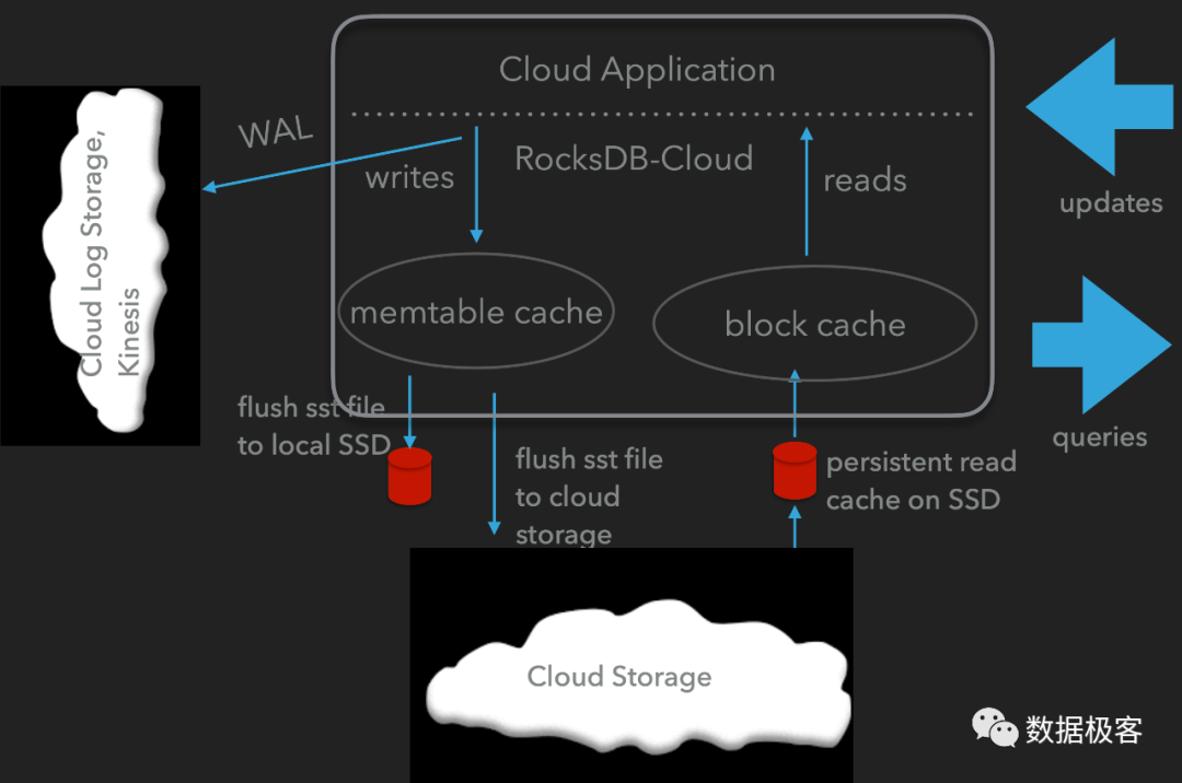 硅谷数据库创业公司RockSet开源了底层存储引擎RocksDB-Cloud,RockSet公司团队基本都来自于Facebook的RocksDB团队,因此他们的Idea是直接把RocksDB搬到S3上,这样上层写数据库应用就可以无缝迁移了。RocksDB-Cloud的架构如下所示,由于S3存储需要以较大尺寸对象为单元进行操作,才能充分利用其吞吐量。如果每条记录都要同步到S3之 上,那么S3存储无法跟上数据库所需要的性能下限。因此,需要机制确保数据在存放到S3之前的高 可靠性,换句话,如果节点在数据同步到S3之前宕机,将导致数据丢失。RocksDB-Cloud的做法是同步一份数据到全局日志,全局日志可以是公有云上的高可靠消息队列服务,也可以是自己搭建的高可靠消息队列等