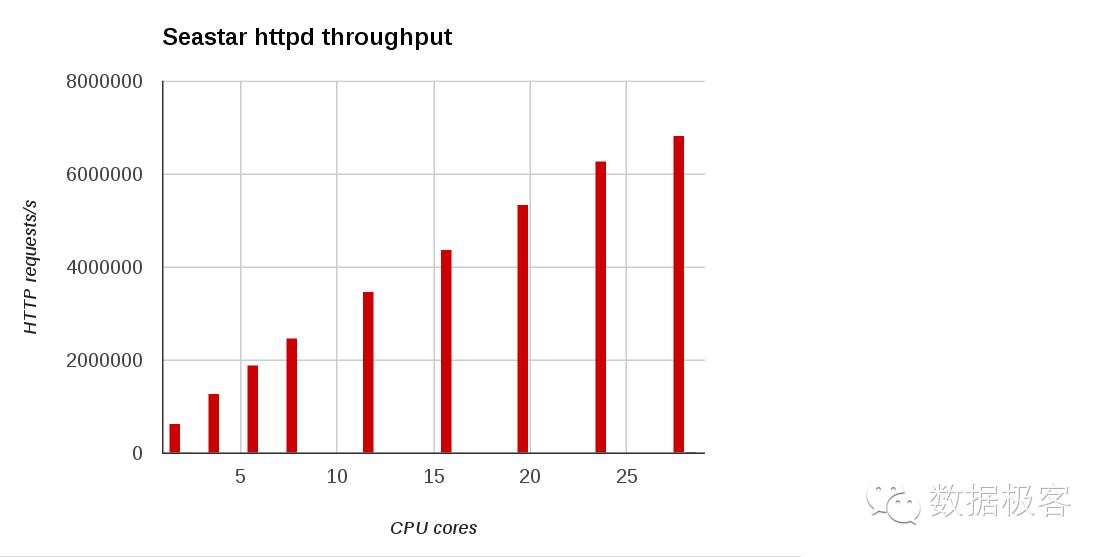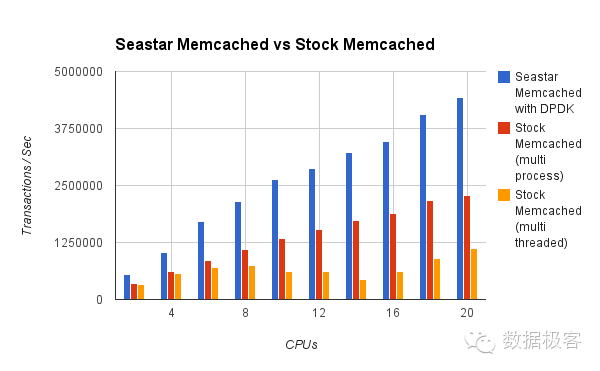 第一个是SeaStar网络框架。在数月之前,来自KVM核心的研发团队推出了一款数据库叫做ScyllaDB,声称拿C++重新实现了Cassandra数据库,单机可以达到百万TPS。坦率说,ScyllaDB如此宣传有些过于哗众取宠,任何了解基础架构底层的人都不会轻易相信该结论在任何场景都能成立。然而,ScyllaDB所真正为人称道的地方并不在于数据库核心存储引擎,而在于其SeaStar网络框架,因为这是首个在常规应用程序中引入用户态协议栈的网络框架,也让其核心Intel DPDK在常规应用开发中为世人所知,看看利用Seastar加速的http和memcached并发可以达到多少级别,并且随着cpu核数增加线性增长,就能感受用户态网络的巨大威力了。SeaStar是目前可用性最好的用户态网络编程框架,在基于DPDK实现了socket语义之后,进一步提供了线程乃至协程的语义封装,便于上层应用使用。