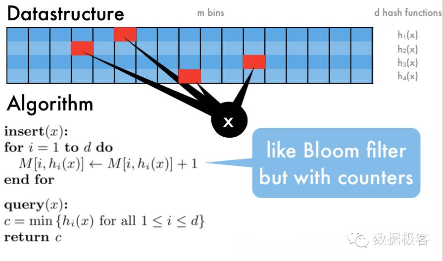 接下来的问题是:如何计算数据流中任意元素的频率。在此之前,我们可以先看一下另外一个更简单一些的问题,那就是:如何查看数据流中某元素是否存在——这显然是用常见的的近似数据结构Bloom Filter来计算。Bloom Filter是一种有假阳性(false positive)的概率数据结构,给定n位的数组,k个hash函数,m个待过滤的元素,则Bloom Filter假阳性概率是(1-e^(-km/n))^k,推导:元素不能落入指定的位置的概率是 (n - 1) / n,那么m个元素,hash了k次,仍未落入指定位置的概率是(1 - 1/n)^(km),即当n较大时,指定位置为0的概率近似于e^(-km/n),为1的概率为1-e^(-km/n)。而假阳性的概率,是k个hash函数产生的k个指定位置, 都为1的概率: (1-e^(-km/n))^k。