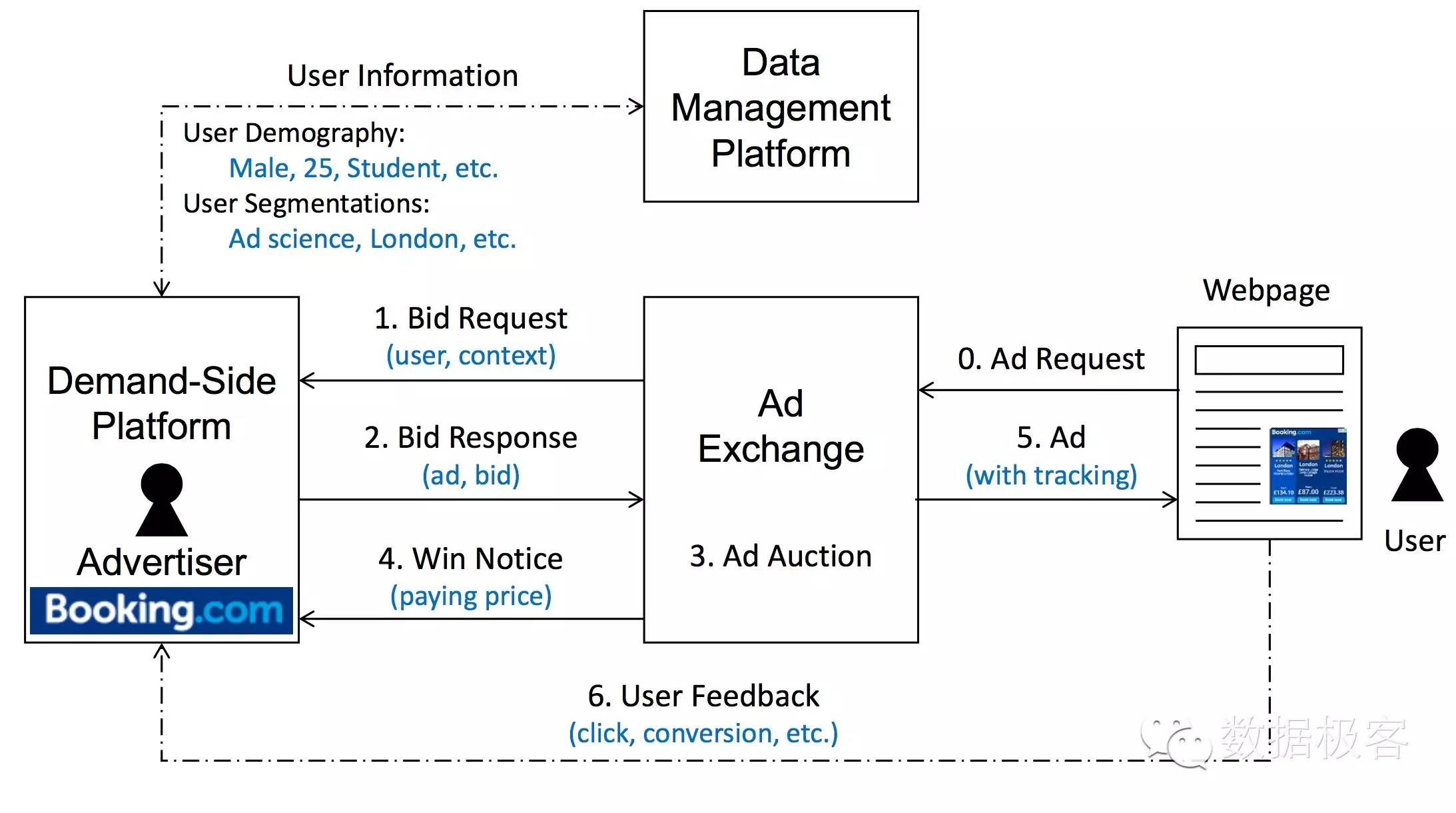 然而,在实际操作中,大量的DSP提供商对如上假设做出了各种简化:比如,复杂的出价过程简化为线性出价甚至固定出价;拿掉DMP模块;仅仅针对Adx提供的流量属性进行受众购买。这样,DSP就被简化成一个由运营人员驱动的实时流量购买系统,工程挑战大大降低。不过,这不是本文所关注的重点,本文仍然试图从理想情况下来介绍一个真正数据驱动的DSP背后的设计和模型。