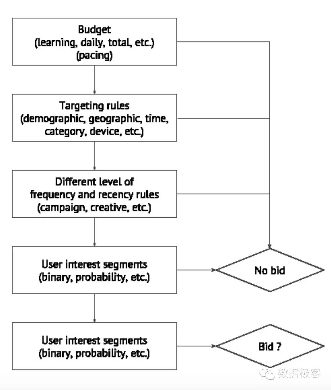 一个DSP的出价决策流程如上图所示,决策引擎所做的事情,就是根据广告主定向条件选出适合的受众人群,然后根据人群的内部和外部属性数据和广告主的预算控制输出最终出价。我们以M6D为例谈论一下这个决策是如何做出的。M6D现在已经改名为Distillery,尽管不是一家出名的广告公司,但却为学术界贡献了良多论文,其中在2012年发表于SigKDD的文章获得当年工业界最佳论文,因此以M6D为例可以更细地了解DSP工业级实现在面临算法和模型上的挑战是如何解决问题的。
