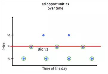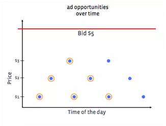 DSP在出价过程中,还需要进行预算控制,这个术语叫做pacing。首先来看看为什么要进行pacing。下图中,蓝色的点代表广告获得展示的机会,黄色的圈代表广告赢得展示,在没有pacing时,容易造成可以看出广告预算在早期用尽,造成前期竞争激烈,但后期无竞争的状态。