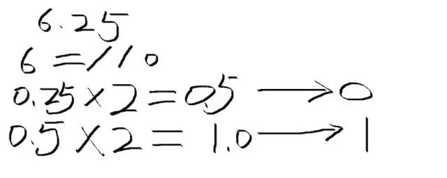 小数转二进制,先把整数为转换成二进制,然后把小数位转换(小数为换算每次乘2,不足1为0),最后相加,6.25的二进制为110.01