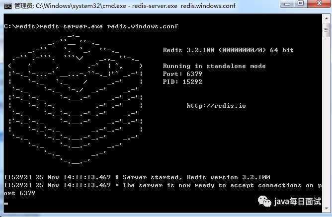 如果想方便的话,可以把 redis 的路径加到系统的环境变量里,这样就省得再输路径了,后面的那个 redis.windows.conf 可以省略,如果省略,会启用默认的。输入之后,会显示如下界面: