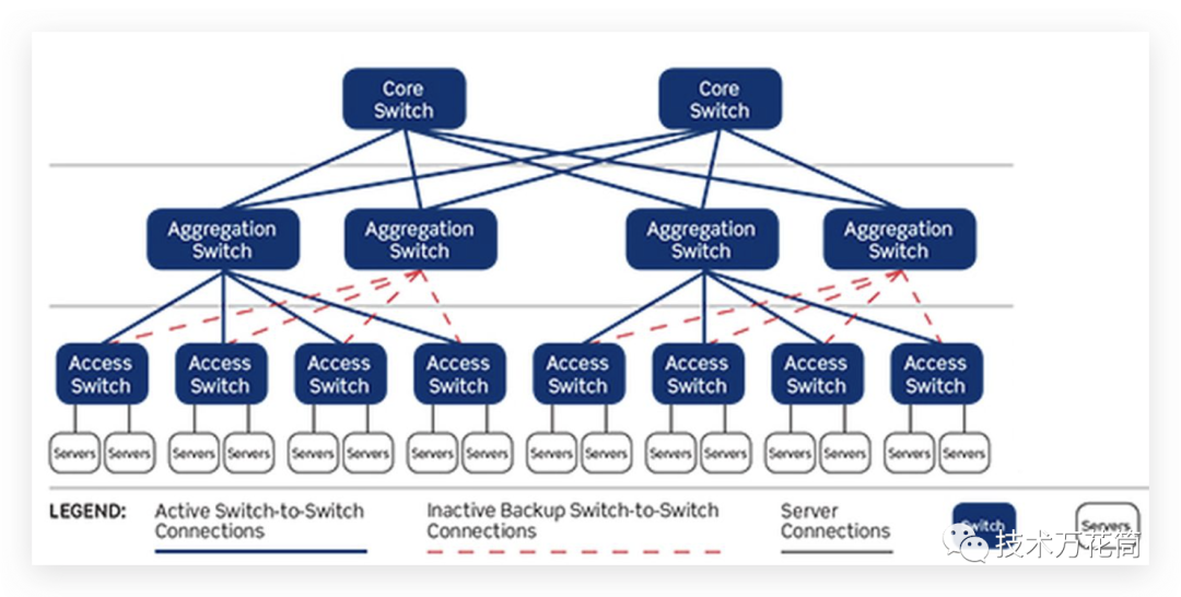 数据中心网络架构有很多种,其中三层是最常见的,交换机分为核心、汇聚、接入层,注意,这些虽然称之为交换机,但是一般都是三层或三层以上交换机,带有路由功能,支持多种路由协议: