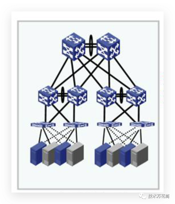 在这种架构下,通过环路检测协议来保证整个交换转发的链路是无欢的,而且在接入层,服务器一般有多快网卡,分别接到不同的交换机上,如果一台交换机故障,也不会影响整体的可用性,这样实现整个链路转发的高可用。